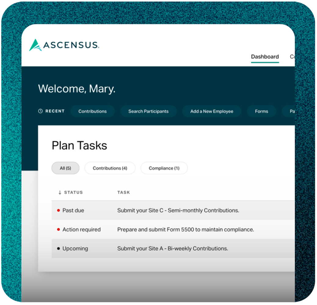 Partnering with Ascensus lets advisors leverage innovative, powerful retirement solutions and advanced capabilities to help plan sponsors, third-party administrators—and the participants they serve—succeed with clarity and confidence.